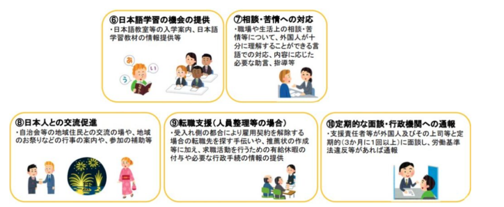今回の<定着支援編>では、特定技能の義務的支援とされている中で、 ⑥~⑩についてお伝えいたします。